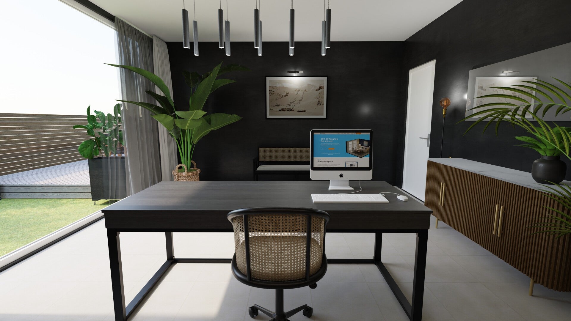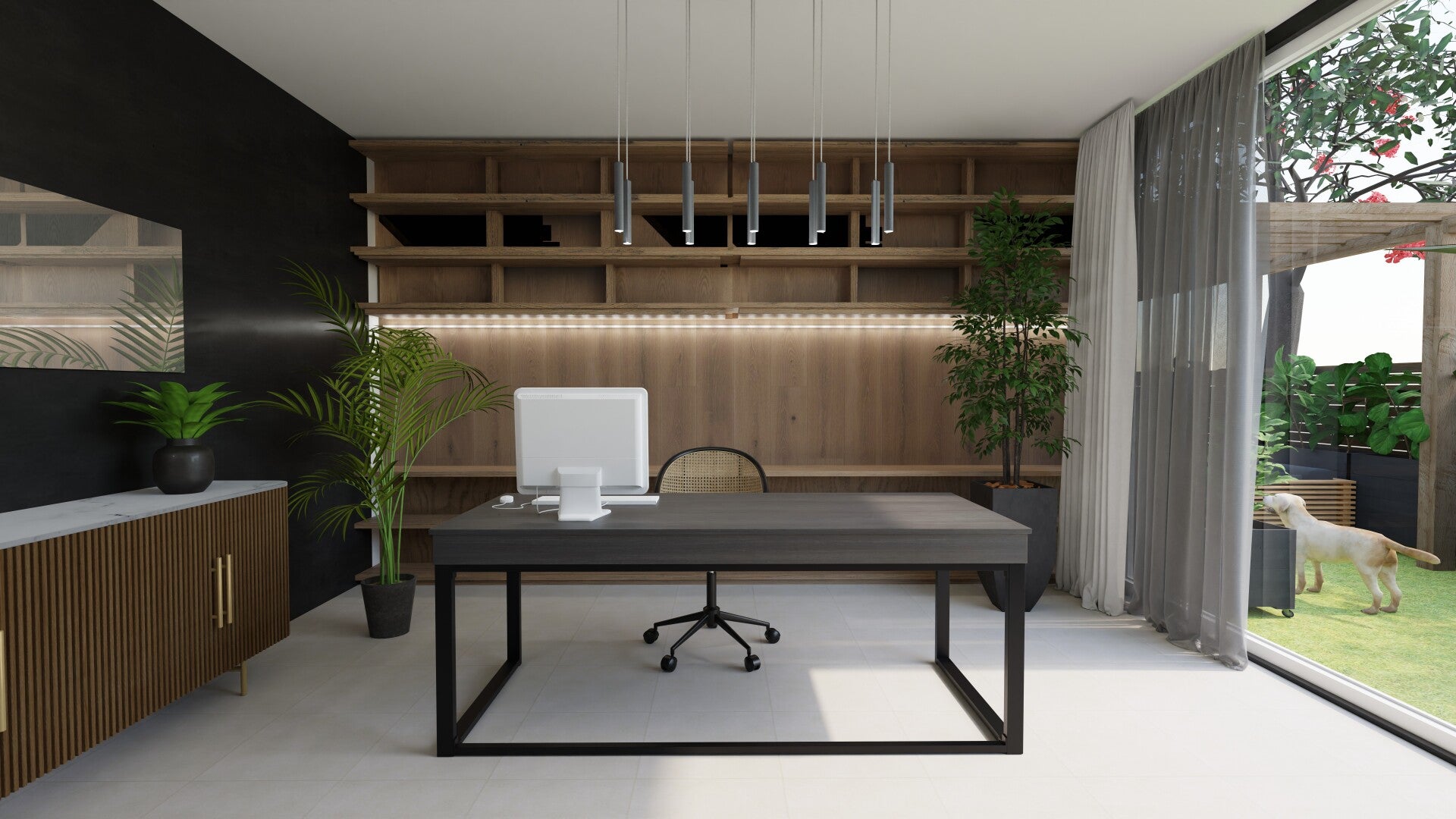 In het thuiskantoor, waar het moderne leven en de natuur naadloos versmelten, omarmen we de Japandi-stijl. Door gebruik te maken van natuurlijke kleuren en materialen creëren we een serene werkomgeving met grote puien die uitzicht bieden op de tuin. Onze transparante gordijnen verzekeren niet alleen privacy maar ook overvloedig natuurlijk licht en een gevoel van ruimtelijkheid.